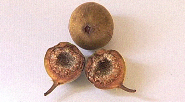 fruto composto ou infrutescência, um conjunto compacto de frutos, onde cada fruto situa-se contíguo ou aderido ao outro, de forma que o conjunto se assemelhe a um grande fruto, de 1,5 cm de comprimento, não comestível. Os verdadeiros frutos são os pequenos gomos encontrados nesta estrutura que se formou dentro do receptáculo fechado da inflorescência. Cada fruto porta uma minúscula semente.